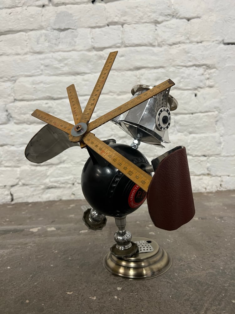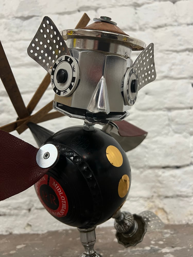 Loverly bird sculpture made from a coffee pot, a bowling ball and some leather from my old sofa! Stands at 45cm tall