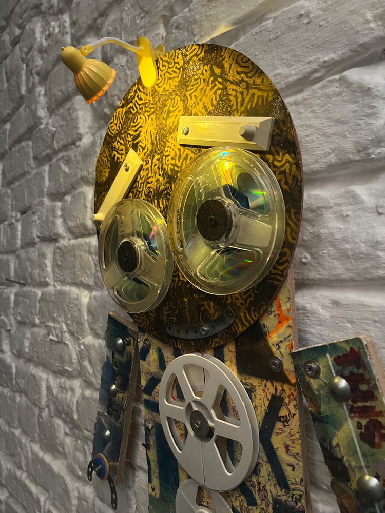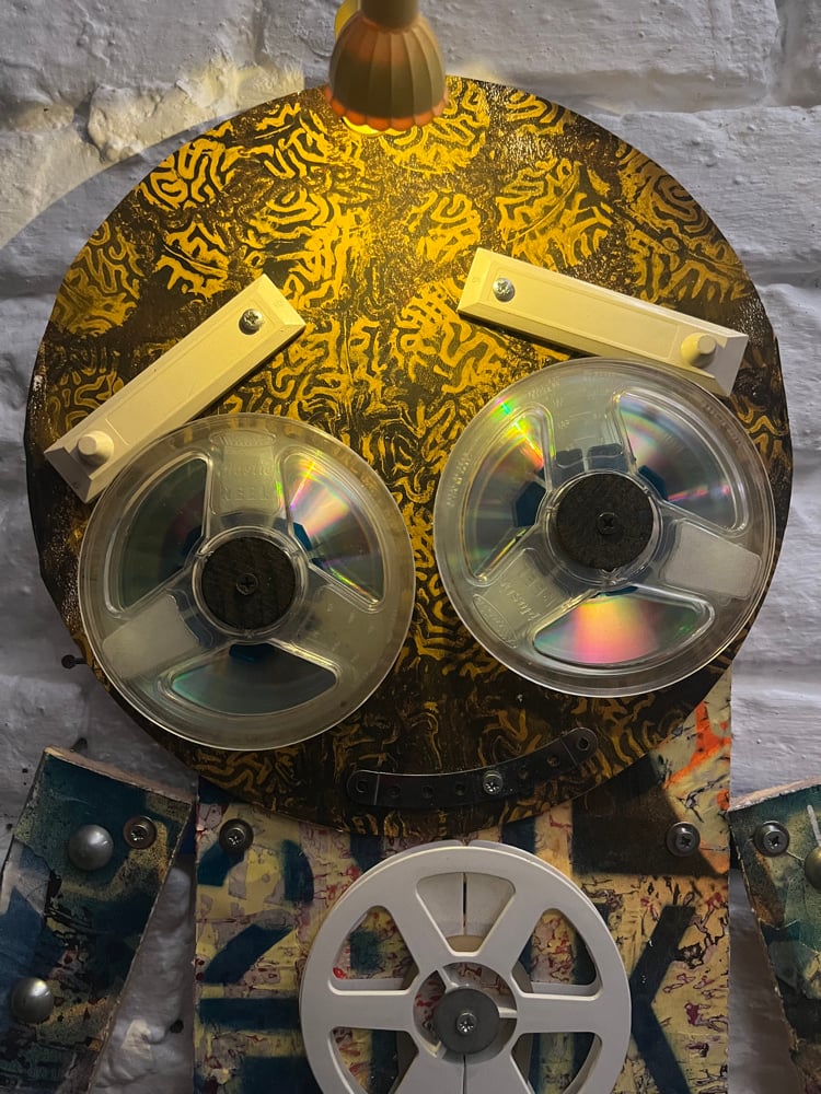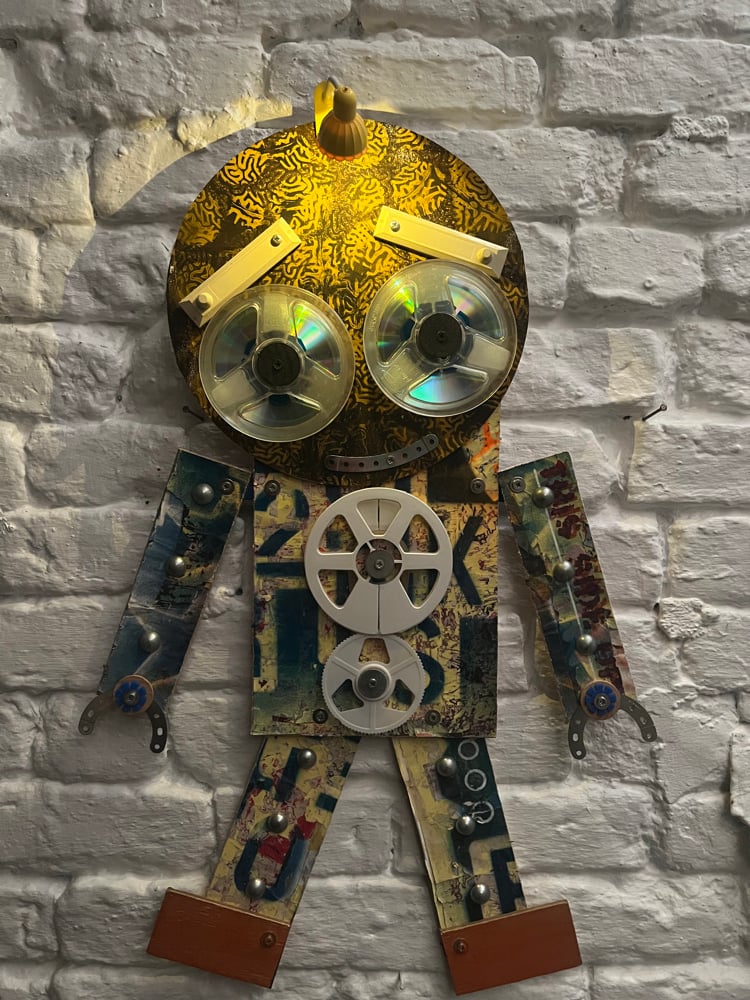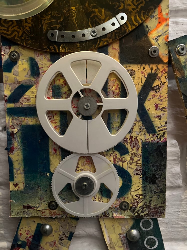 Brains is a wall hanging robot sculpture. I made him using Gelli printed papers then collaged lots of robotty bits on top. He’s poseable in that his arms, legs and head are all articulated. There’s a little battery powered light on his head to help him see in the dark. Just a little word of warning, they look great once hung but the back of them looks a bit rough as it’s all the fixings and raw wood. I didn’t think it necessary to make it look better so I just wanted to warn you.