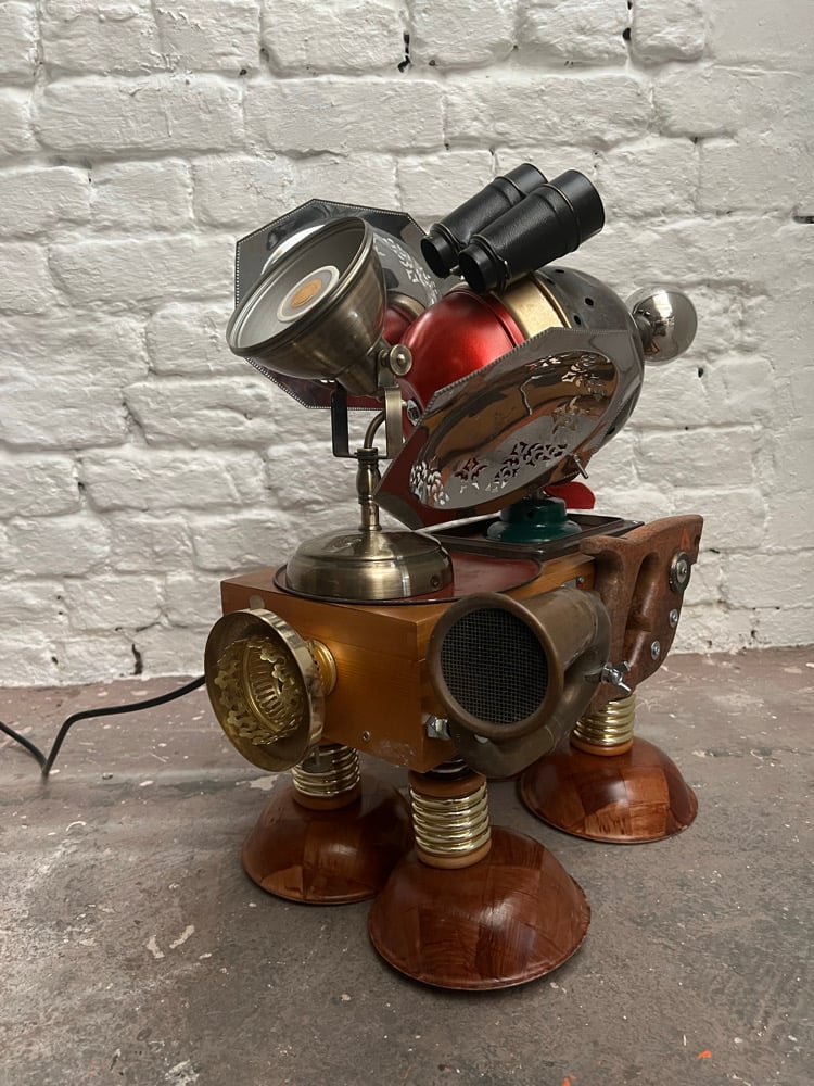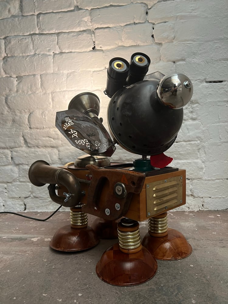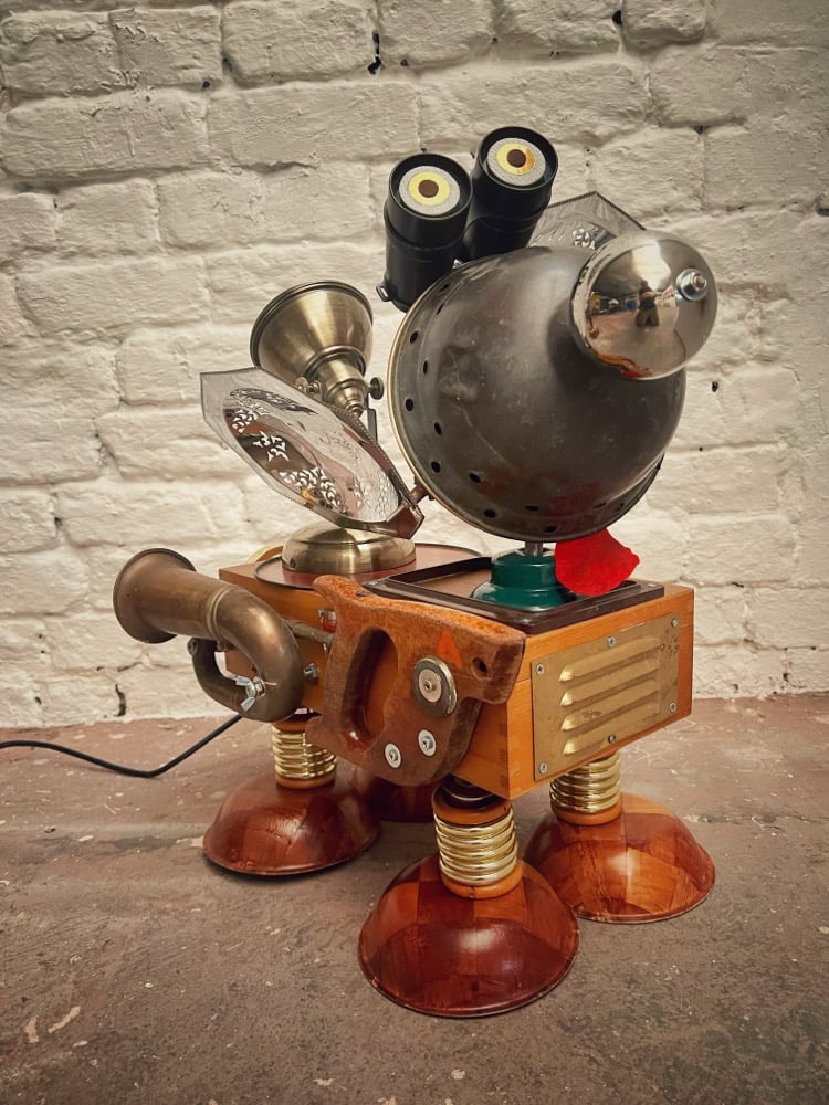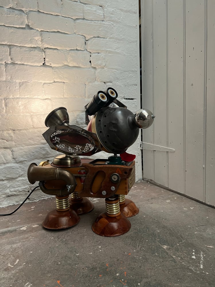 Curly stands at 58cm tall, 58cm long and 38cm wide. He’s made from a wooden writing box, some wooden bowls, serving trays and a plunger type thingy.