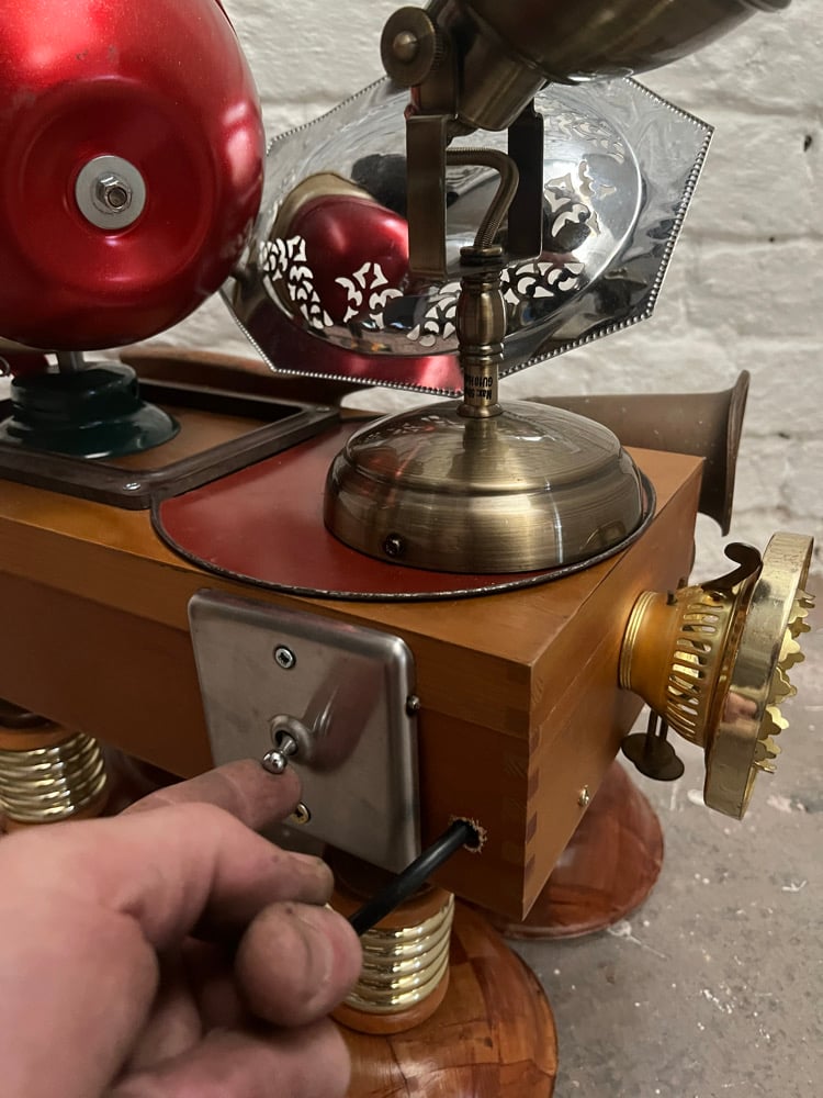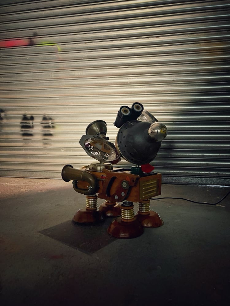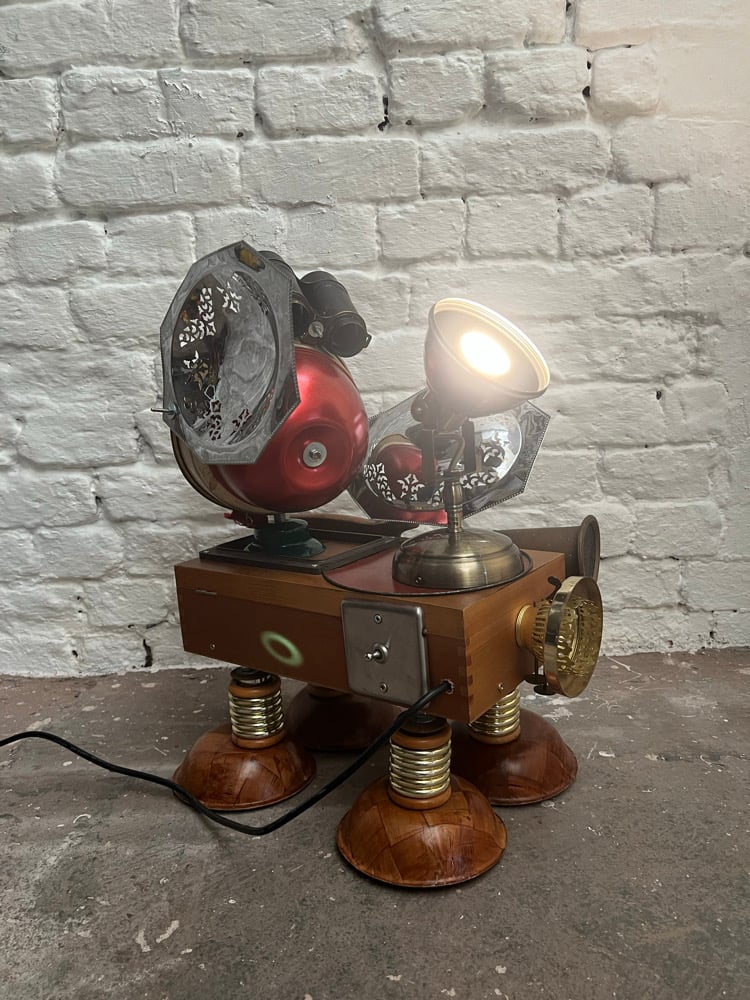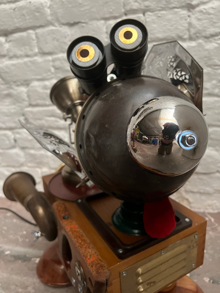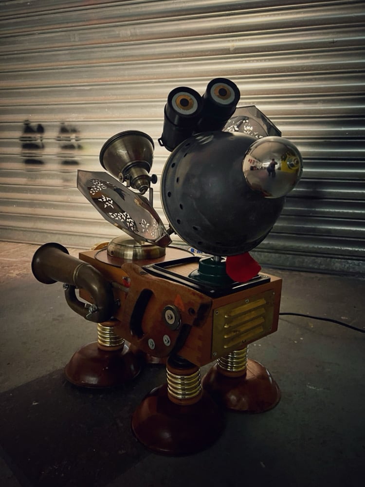Curly stands at 58cm tall, 58cm long and 38cm wide. He’s made from a wooden writing box, some wooden bowls, serving trays and a plunger type thingy.