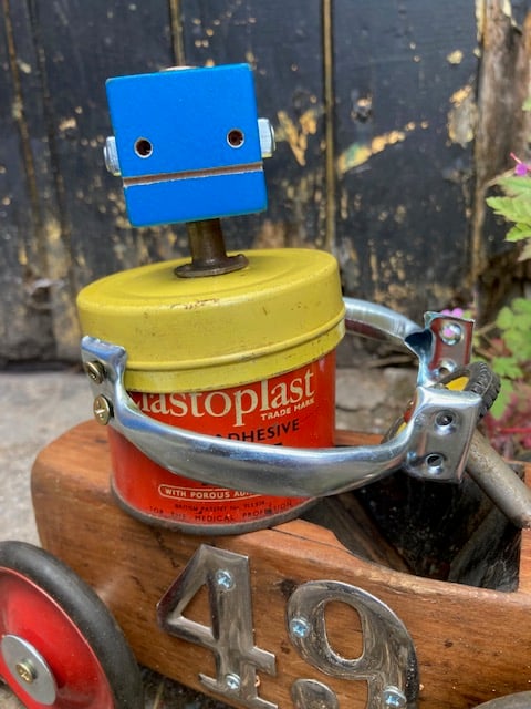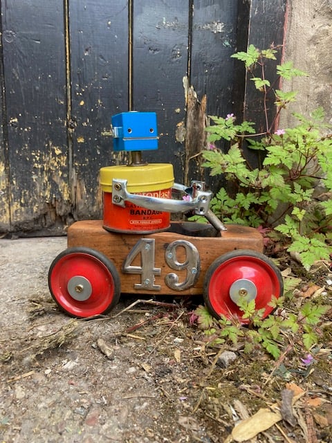 Elasto rides his little car around Frimpton on the Wiggle whilst farting iron filings out the back end. He's very environmentally friendly in that he's powered by Haribo and green beans. He's made from a 1950's plane, some 1950's Meccano wheels and a 1960's tin. He's 30cm long and 25 cm tall.