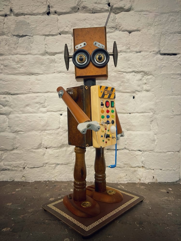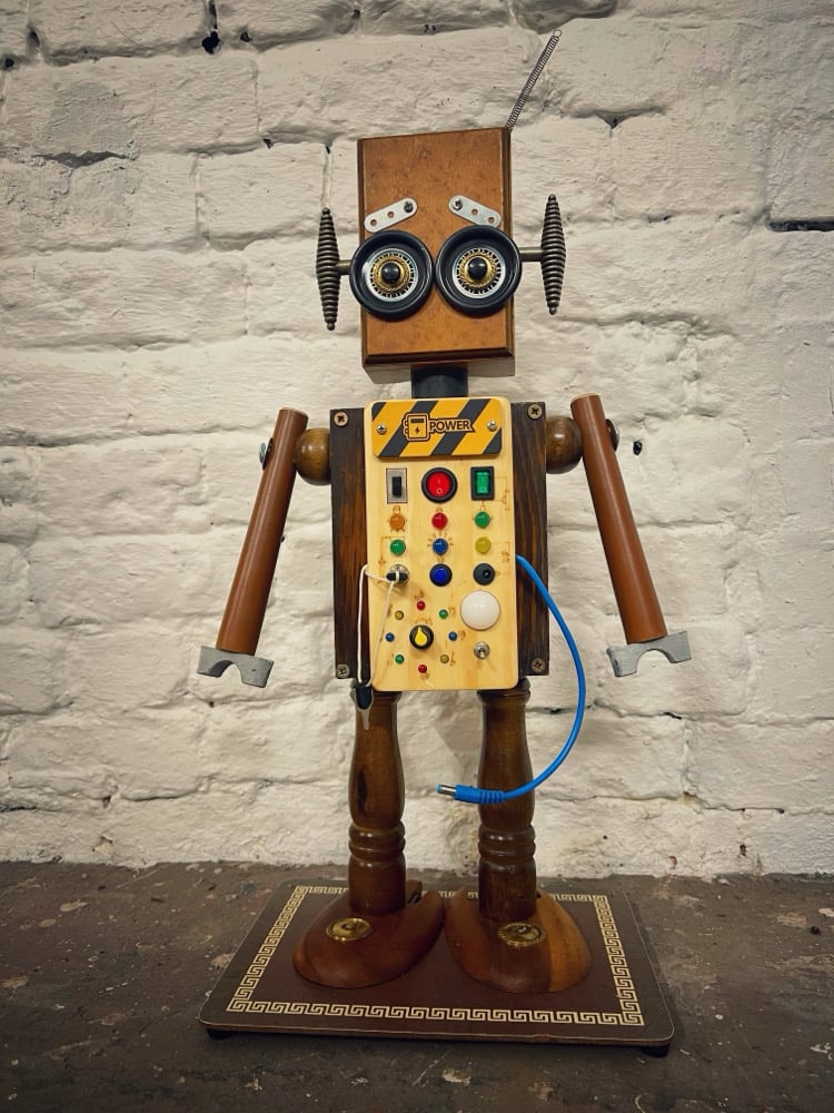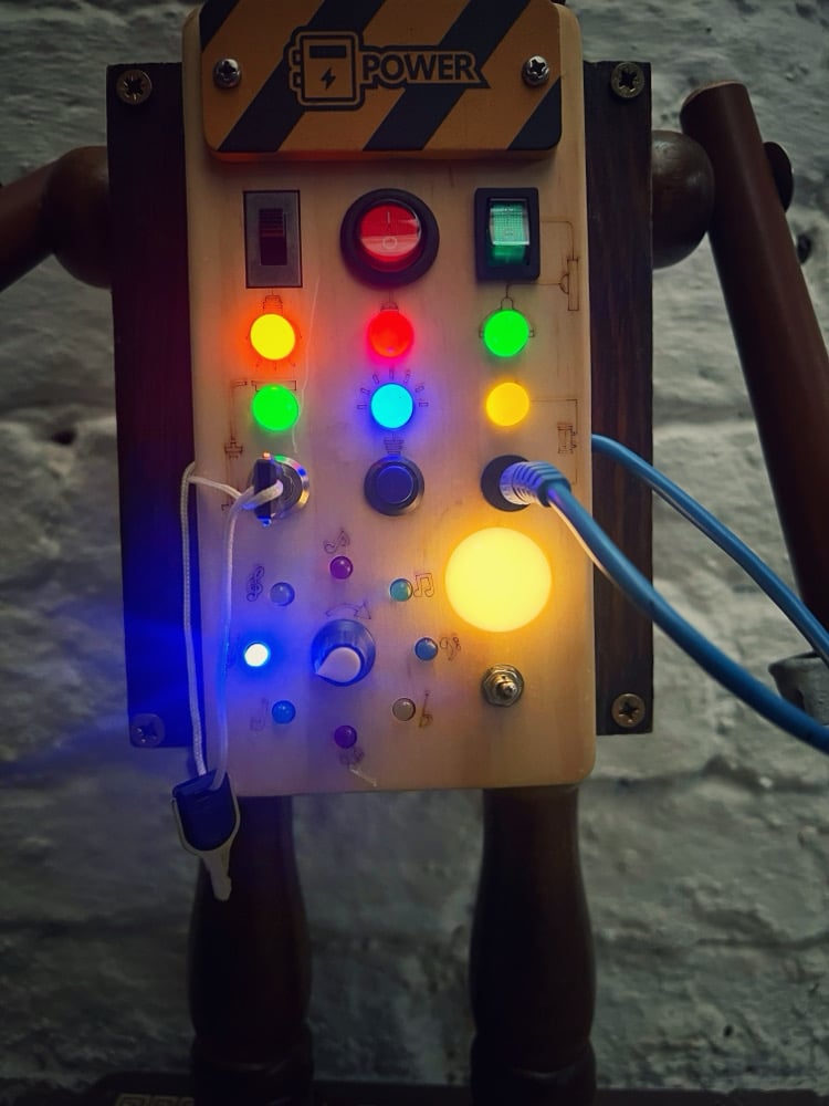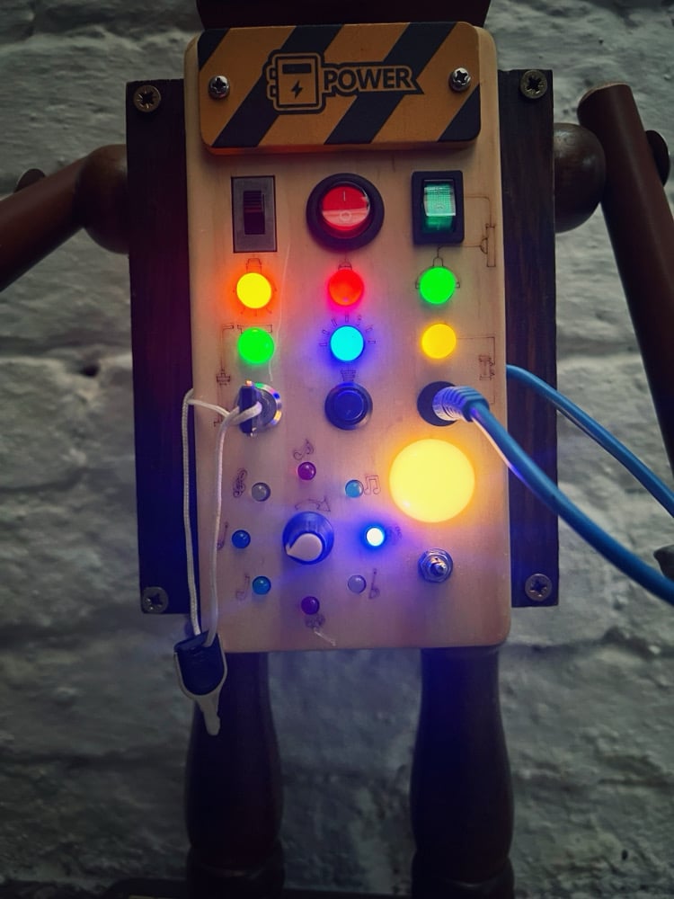 Fidget has one of those kids light up fidget toys on his belly that allows different lights to go on when buttons are pressed. There’s also a cool set of led lights that’s chase round in a circular sequence with adjustable speed. Everything is powered by 2x1.5v batteries