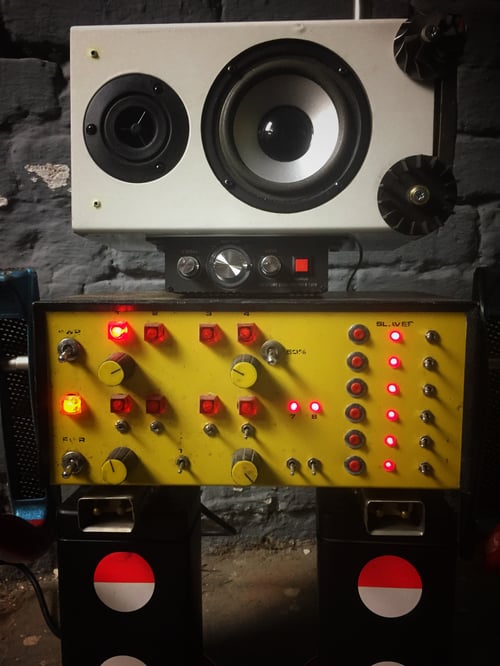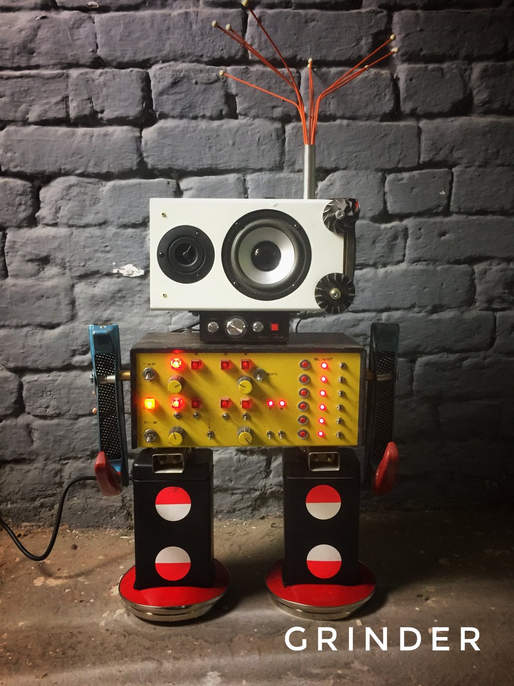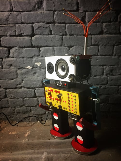 Oh my frumbly knackers! Have you seen this? This fella took me ages to design and build, but was a real labour of love. If I didn’t have a mortgage to pay and 2 kids to feed them he’d be in my house😬. The body is a 1970’s lighting desk controller that has lights that flash in sequence (I’ll put a video of him up on Instagram (Gizmobots1). His head is a speaker and I’ve put another speaker on the right hand side so it’s stereo. He sounds wicked! Plug in any source with a headphone socket and he’ll rock any room. He stands at 90cm tall to the top of his antenna.