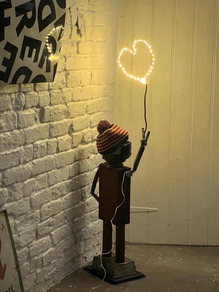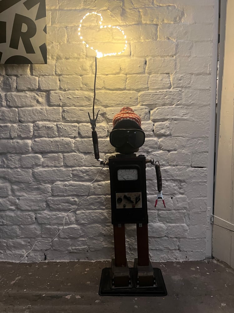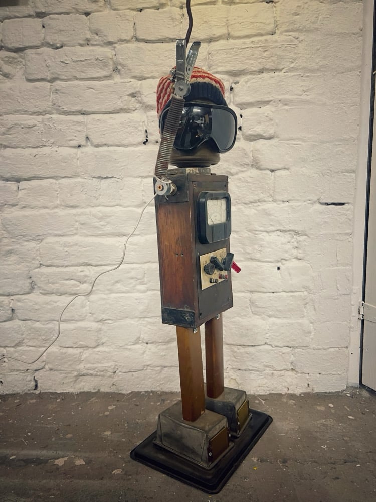 He is made from a lovely, hand made meter from the 1950’s, some loaf tins and topped off with a ski hat and goggles.