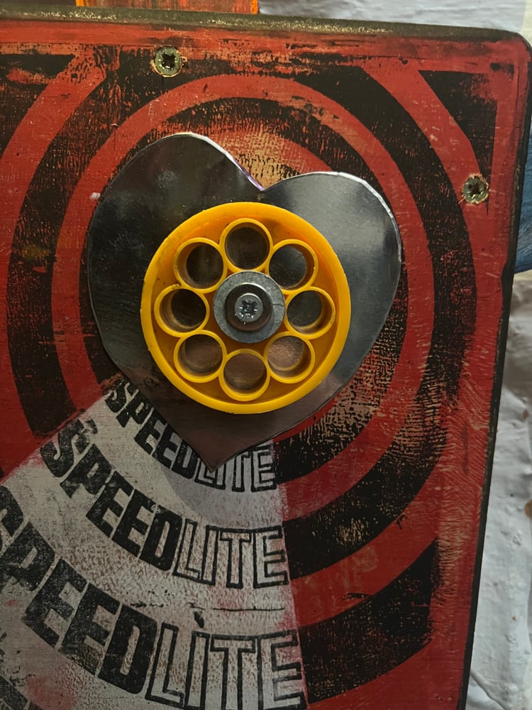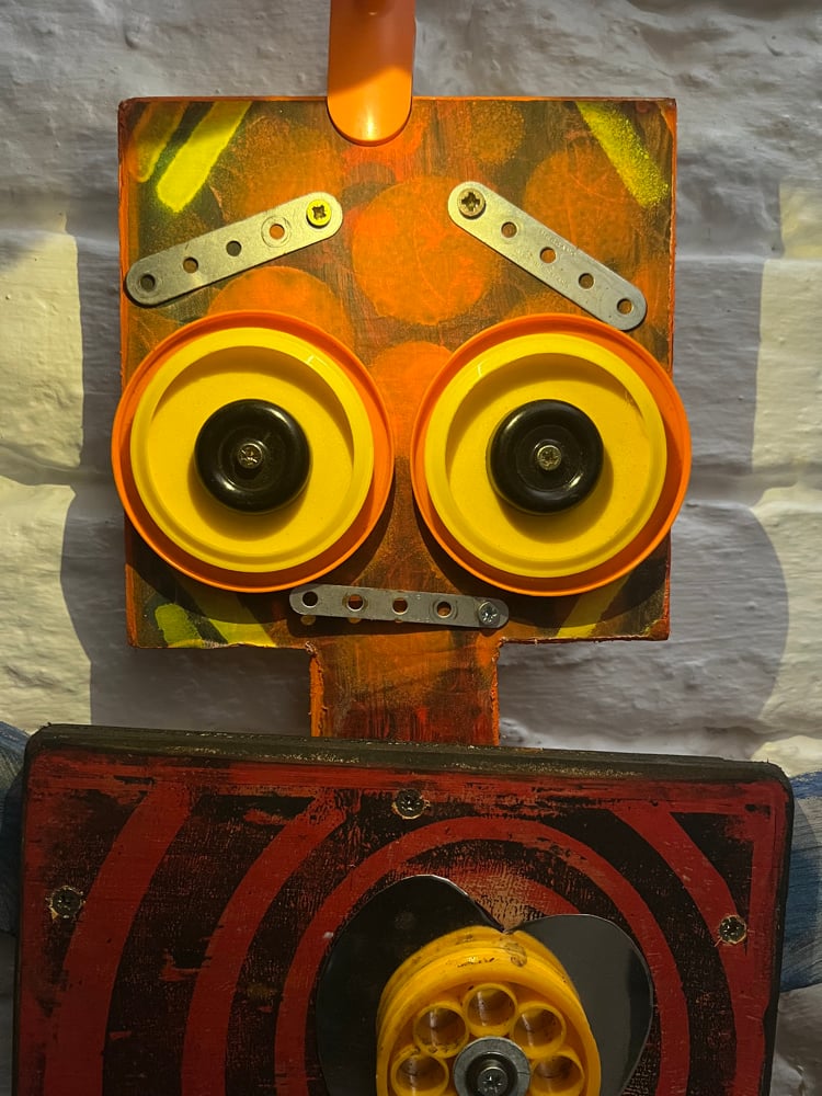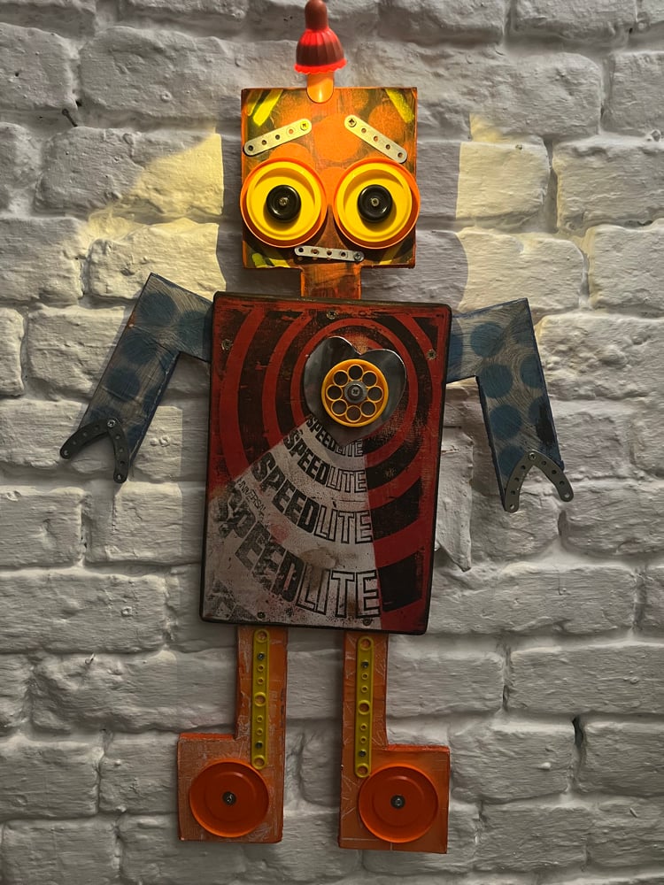 Speedlight is a wall hanging robot sculpture. I made him using Gelli printed papers then collaged lots of robotty bits on top. He’s poseable in that his arms, legs and head are all articulated. There’s a little battery powered light on his head to help him see in the dark. Just a little word of warning, they look great once hung but the back of them looks a bit rough as it’s all the fixings and raw wood. I didn’t think it necessary to make it look better so I just wanted to warn you.