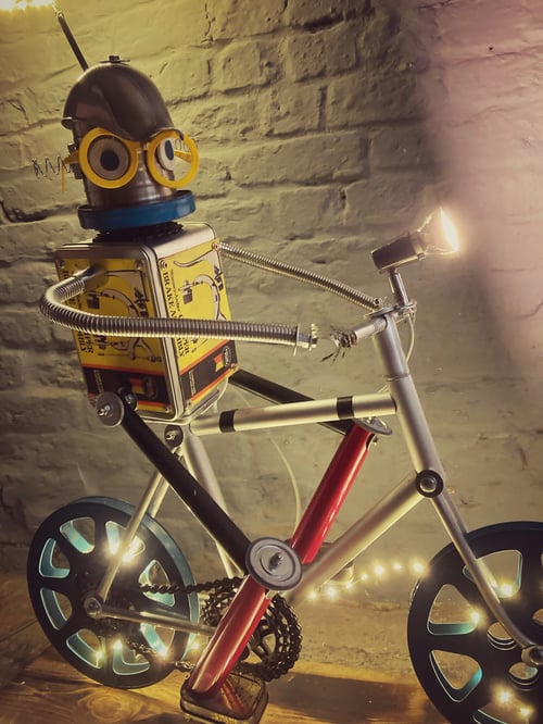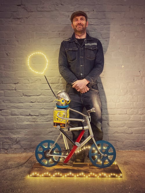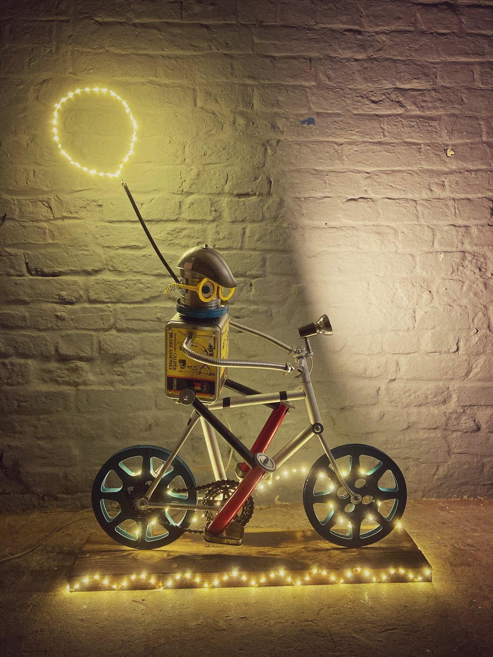 I’ve loved bikes and robots all my life so I thought I’d build a robot riding a bike. It’s a big piece but would look amazing in the window of a bike shop or on the wall of a mancave? All the lights are built into the sculpture and I’ve left a very long mains cable on it to increase the positioning options.